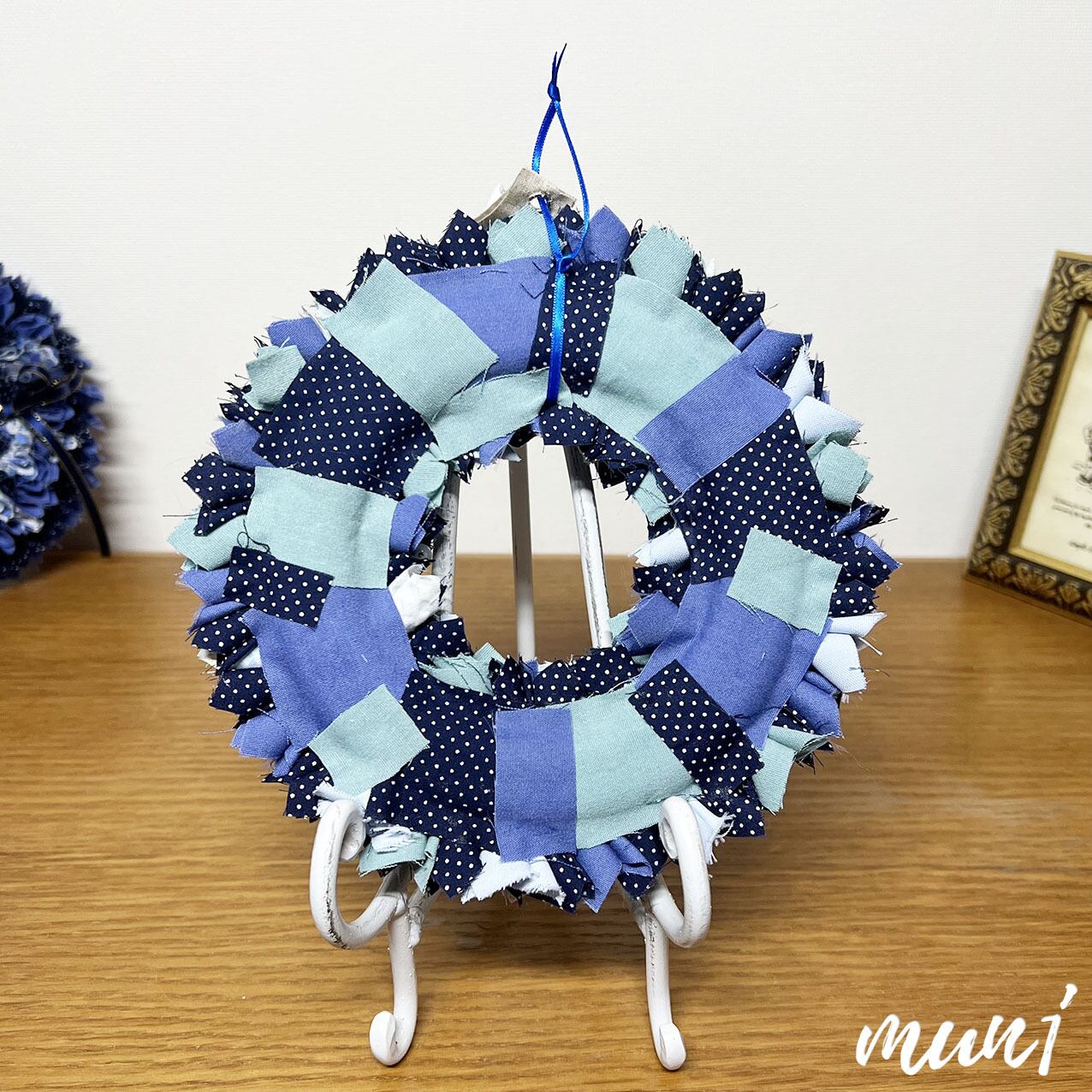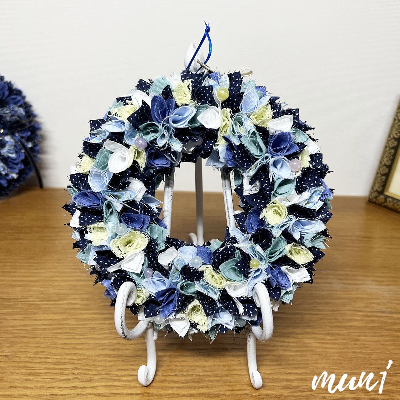 春らしさを少し混じえたブルーカラーの布リースです。